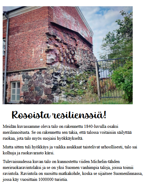 Suomenlinna tarjosi aarreaitan rosoisen resilienssin nähtävyyksiä ja tarinoita toimintamallia tukemaan. Mikä olisi sinun lähiympäristössäsi sopiva rosoisen resilienssin retkikohde? Entä millaisia resilienssitarinoita muihin maailmanperintökohteisiimme kytkeytyy?