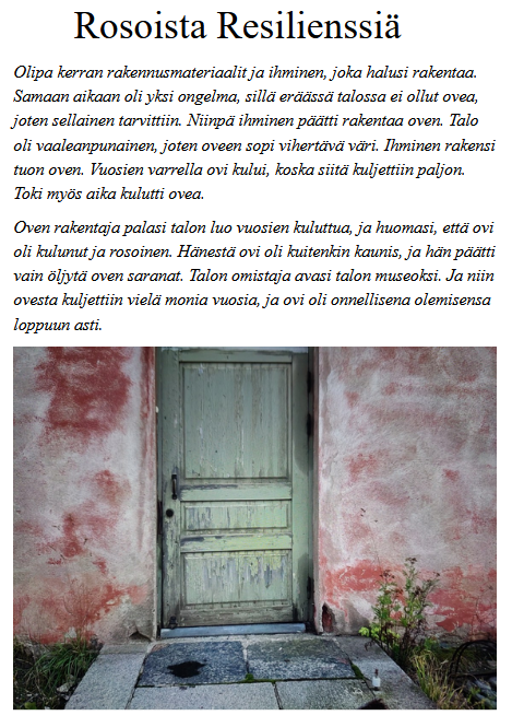 Alustavasti oppilaiden kanssa aiheesta keskustellessa monet vastaukset yhdistivät loistavan tulevaisuuden korjaamiseen, joten tarinointia ohjattiin muistuttamalla resilienssiin kuuluvan myös epätäydellisyyden hyväksyminen: Kaiken ei tarvitse olla uutuuttaan hohtavaa ja kiiltokuvamaista, myös rosoisuus voi olla kaunista. Paikat ja asiat voivat täyttää tarkoituksensa tai niille voi keksiä uusia tarkoituksia kuluneinakin. Loistavaan tulevaisuuteen ei siis välttämättä tarvitse kuulua paikan korjaaminen uudenveroiseksi, kunhan korjaamatta jättäminen ei aiheuta täydellistä tuhoutumista ja vaaraa. Pohditaan, mikä milloinkin on tarpeellista. Patina on kaunis käsite! Ja kauniita olivat myös oppilaiden resilienssitarinat: