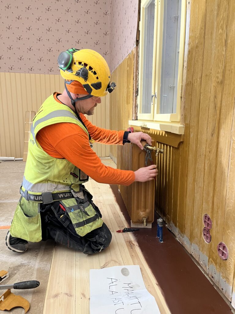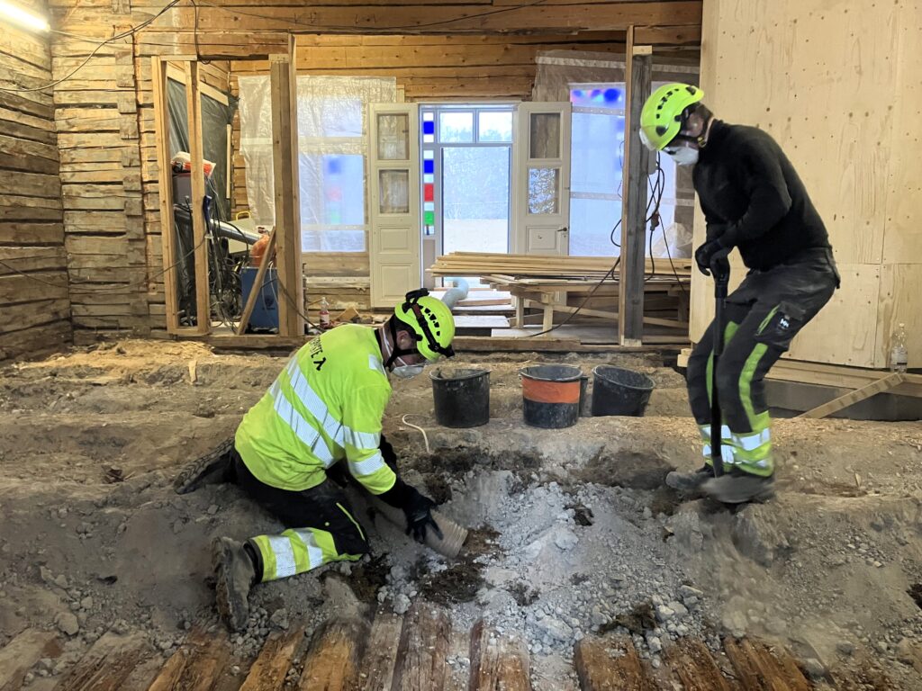 Restaurointi käynnistyi lokakuussa 2023. Ensimmäisinä työvaiheina purettiin ensimmäisen kerroksen lattia, jotta päästiin alapohjiin käsiksi. Vanhat noin 70 mm paksut, irtopontilla varustetut lattialankut irrotettiin ehjinä takaisinasennusta varten. Rakennuksen alapohjan lahovaurioiden laajuus yllätti. Alapohjissa oli lämmöneristeenä käytetty savea, johon säävaihteluiden myötä sitoutunut kosteus oli vähitellen lahottanut lattian alapuoliset puiset rossirakenteet. Uudeksi lämmöneristeeksi valittiin saven sijaan puhallettava puukuitueriste.
